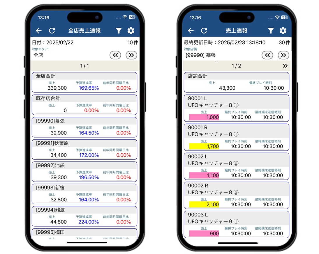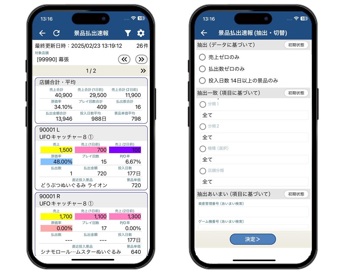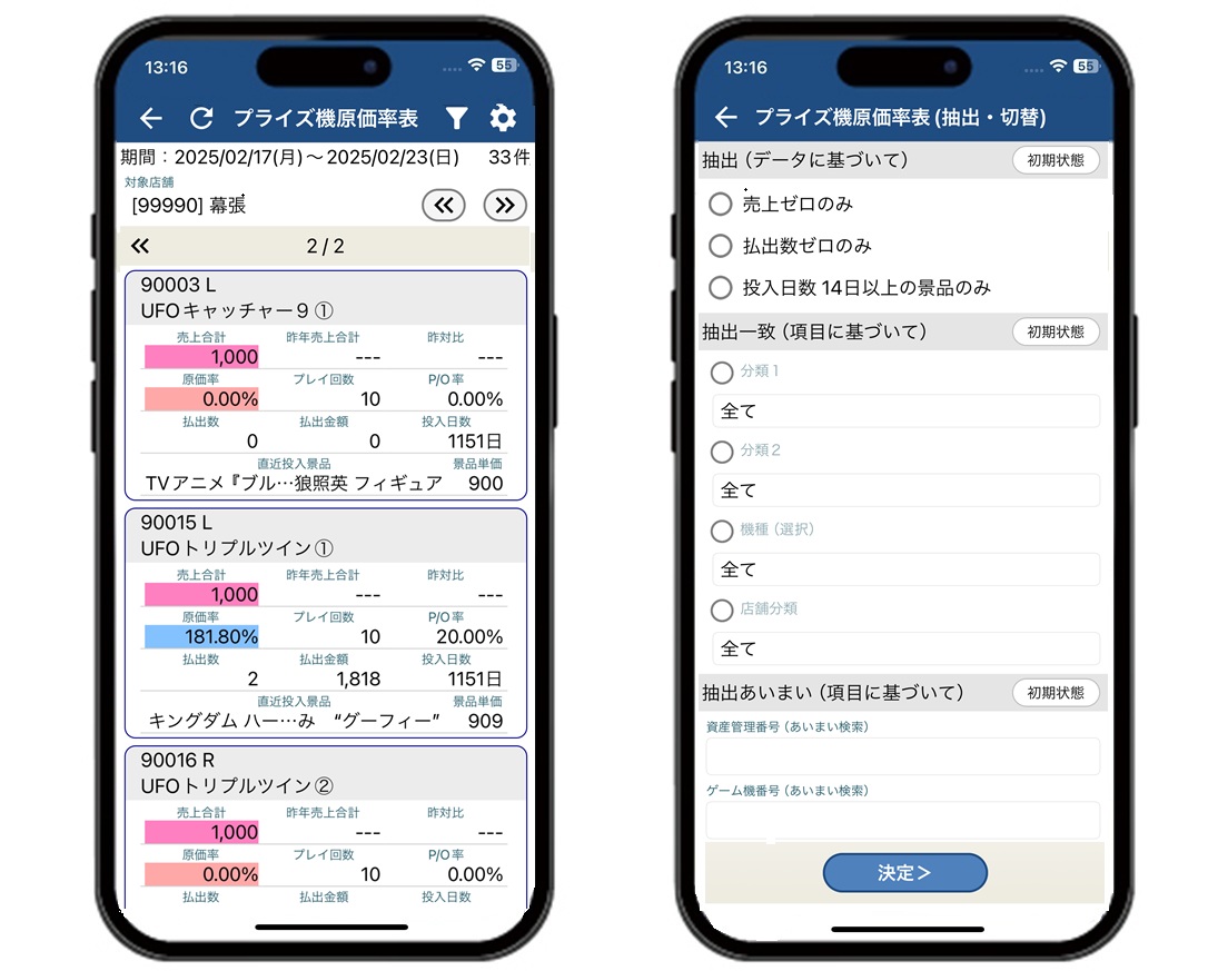 店舗の詳細画面では、ゲーム機個々の売上を確認できるほか、売上順でのソートや、機種、ジャンルで絞り込みによって、原因を探ります。